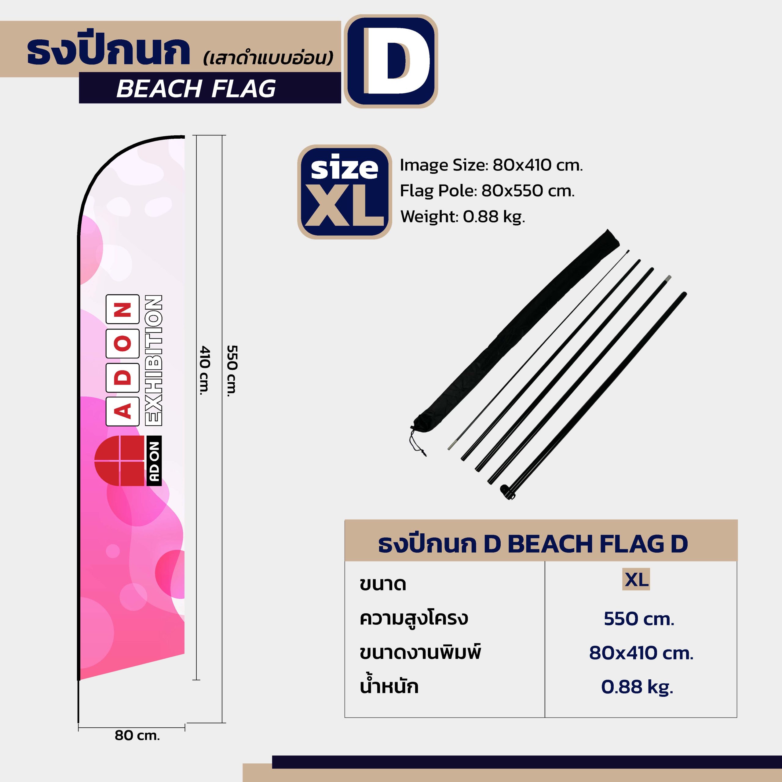 ธงปีกนกแบบ D (แบบเฉียง) เหมาะสำหรับ การทำสื่อโฆษณา การประชาสัมพันธ์ ที่ต้องการการมองเห็นจากระยะไกล สามารถใช้ได้ทั้งภายใน และ ภายนอกอาคาร โครงสร้างประกอบด้วย ฐาน โครงเสาอลูมิเนียม ปลายเสาแบบไฟเบอร์ที่มีความยืดหยุ่นสูง ทนทาน ใช้งานได้ยาวนาน และ มีขนาดให้เลือกใช้งานที่หลากหลาย พร้อมให้คำปรึกษาด้วยทีมงานคุณภาพจาก AD ON